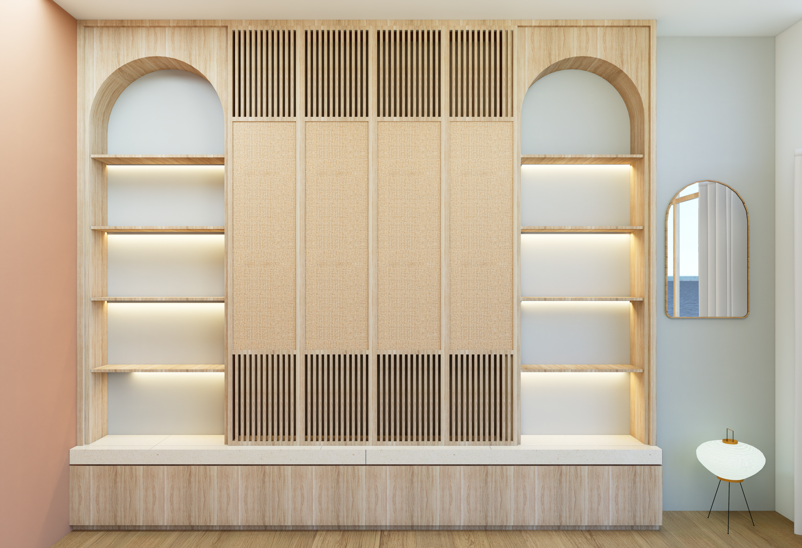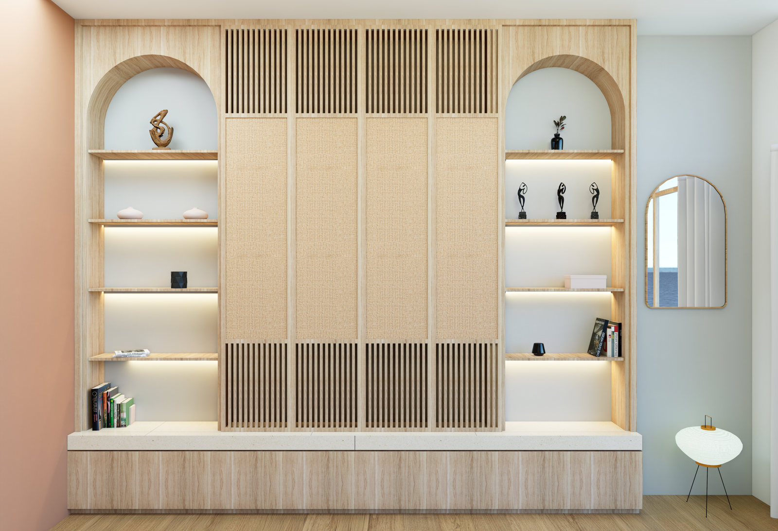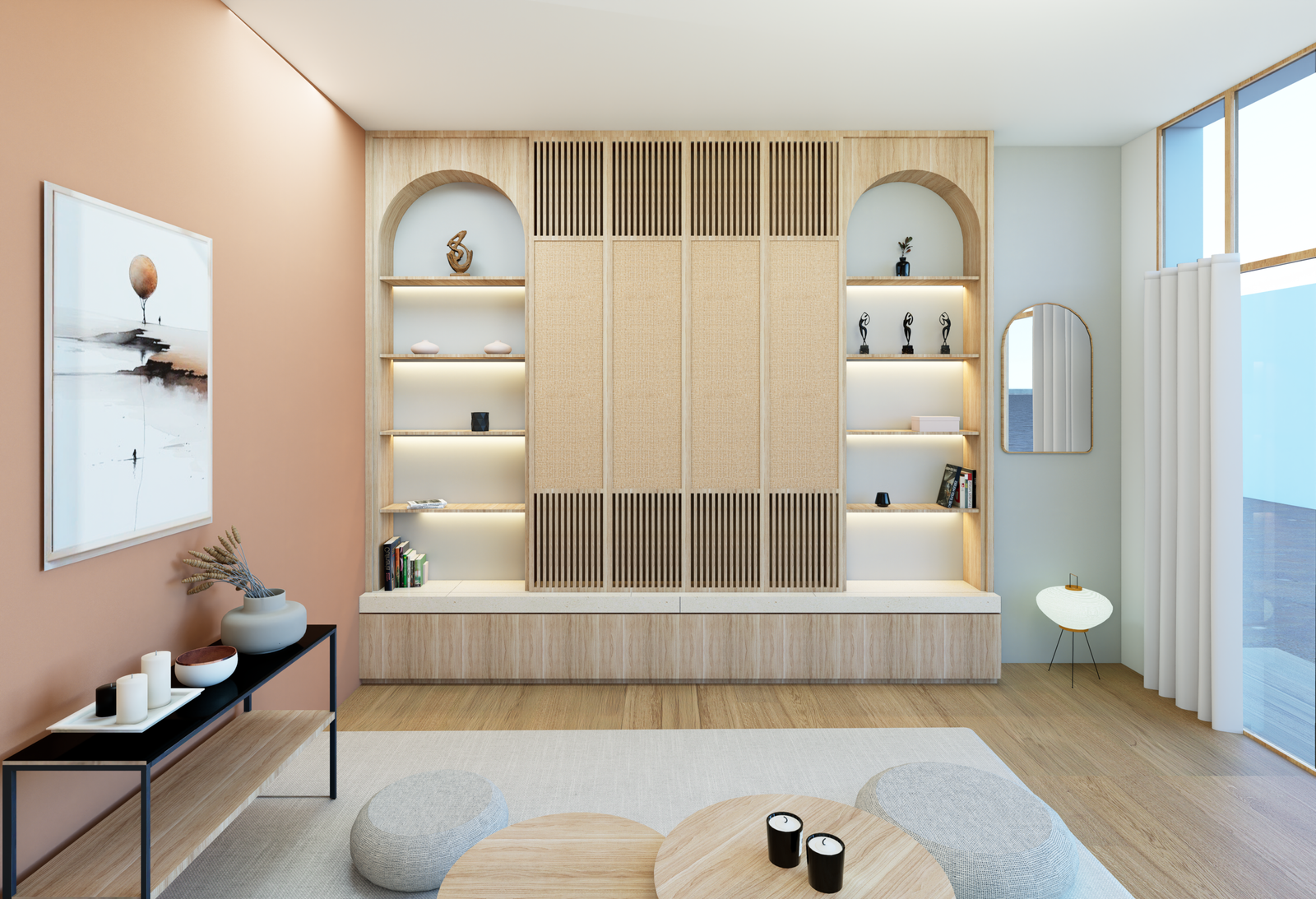 Une bibliothèque décorative composée de deux arches de part et d’autre de la télévision, vient encadrer l’écran.