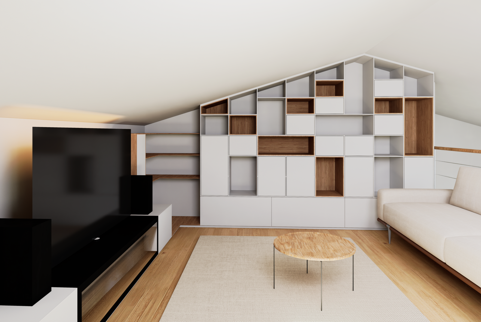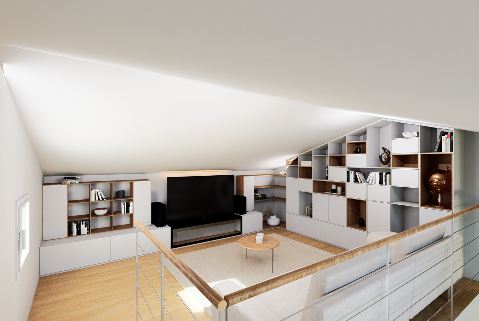 Aménagement sur mesure en L d’une mezzanine sous pente. Création d’un espace TV et bibliothèque à la demande du client. Association harmonieuse de bois et blanc pour une ambiance douce et contemporaine.