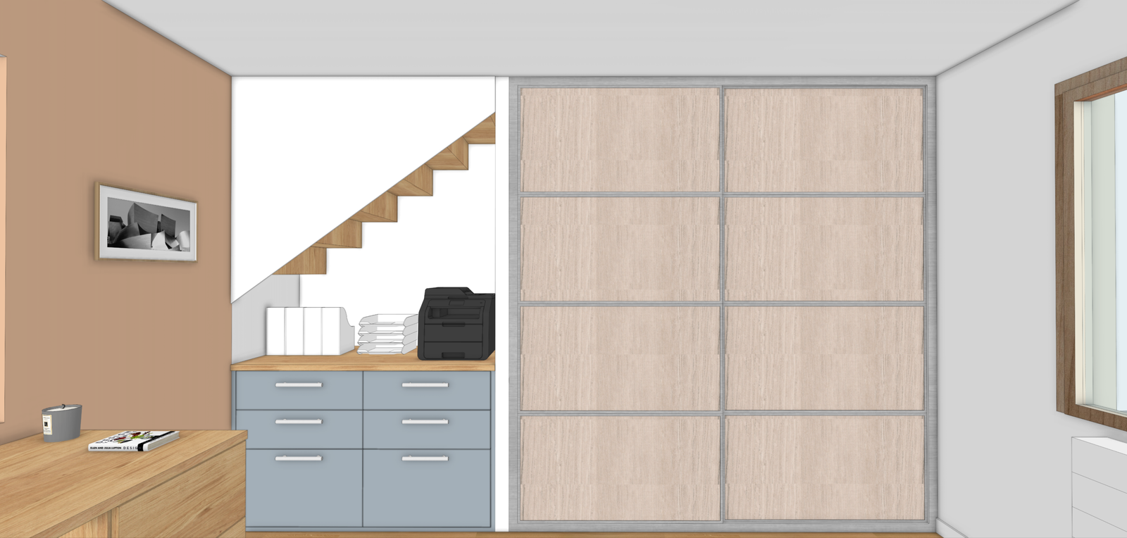 Un aménagement sous escalier avec tiroirs intégrés est surmonté d’un plan décor bois dédié aux imprimantes.