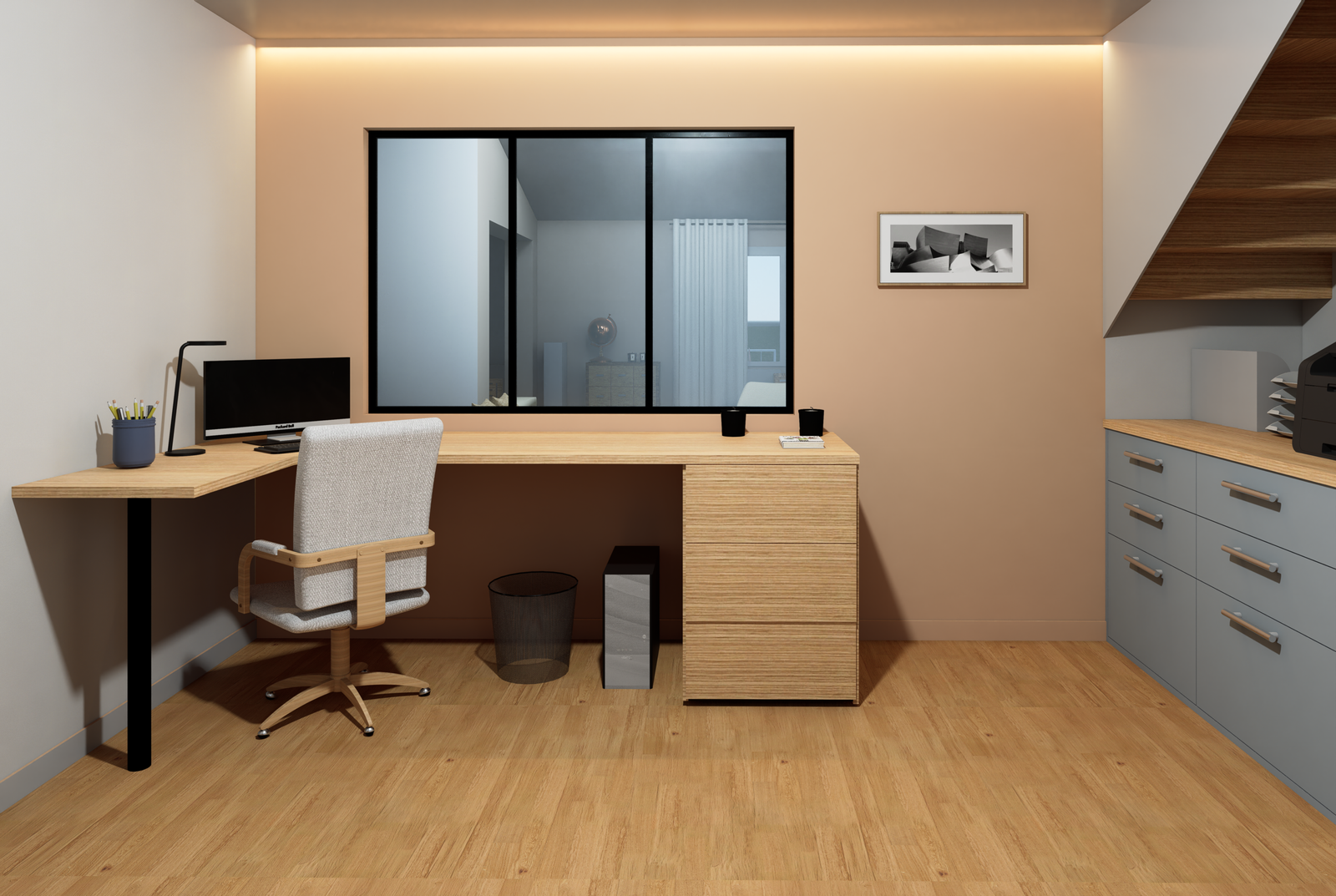 Ce projet concerne l’aménagement complet d’un grand bureau destiné à accueillir deux espaces de travail confortables et fonctionnels. L’objectif était d’organiser la pièce de manière fluide, d’optimiser les rangements et d’apporter d’avantage de lumière.