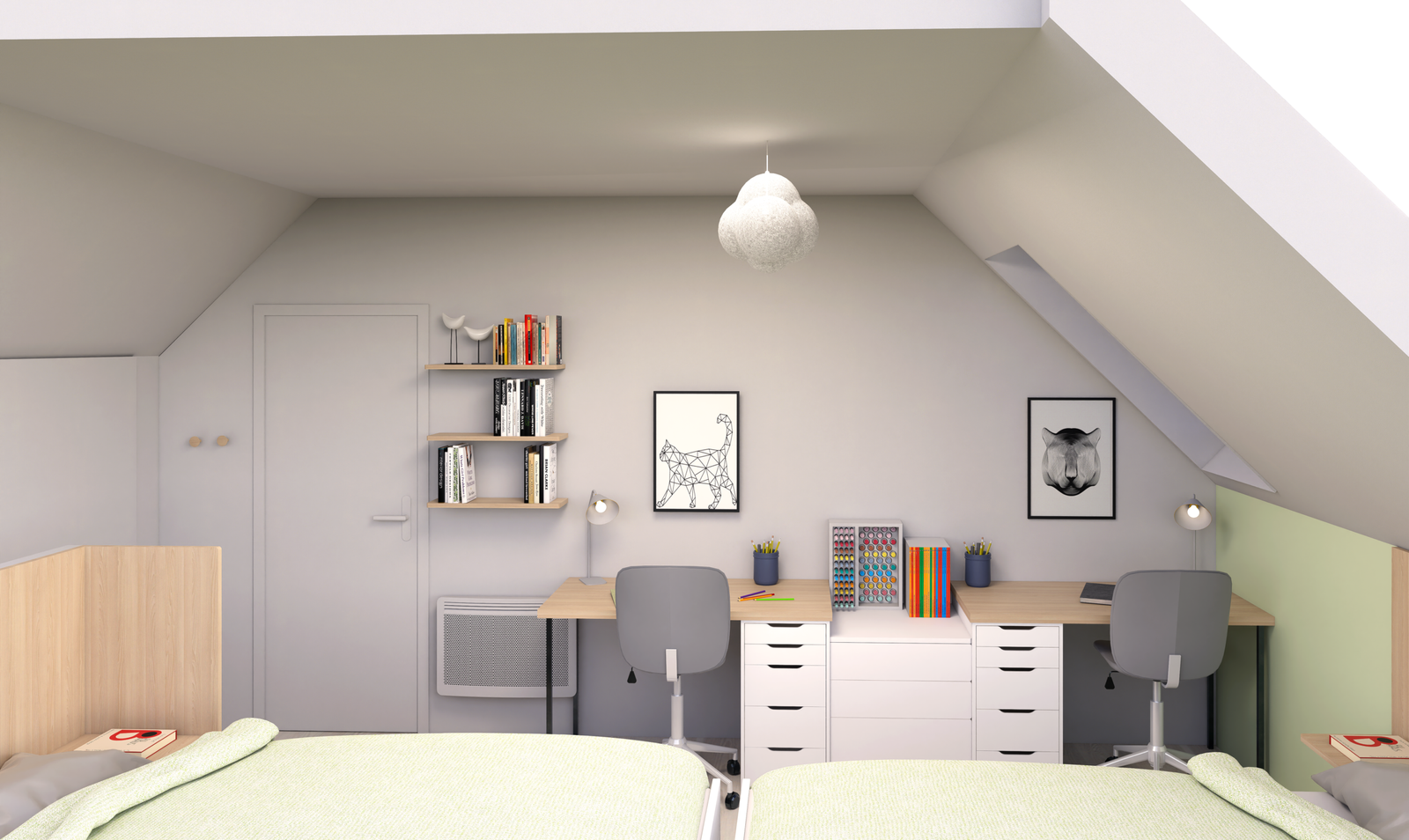 Aménagement d’une chambre sous pente conçue pour accueillir deux enfants dans un espace chaleureux et fonctionnel.